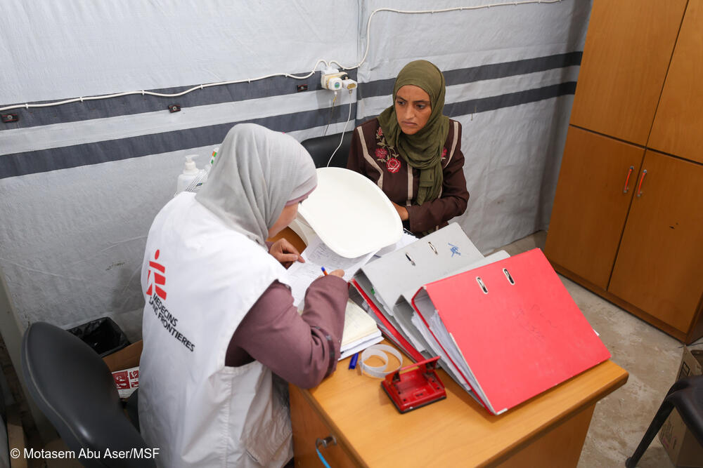 Una enfermera de MSF examina a Nour, embarazada de siete meses y que sufre desnutrición, durante una consulta en el abarrotado Centro de Atención Primaria de Salud (PHCC) de Attar, en Khan Younis. La clínica lucha por atender a la avalancha de pacientes, muchos de los cuales son mujeres embarazadas y niños.