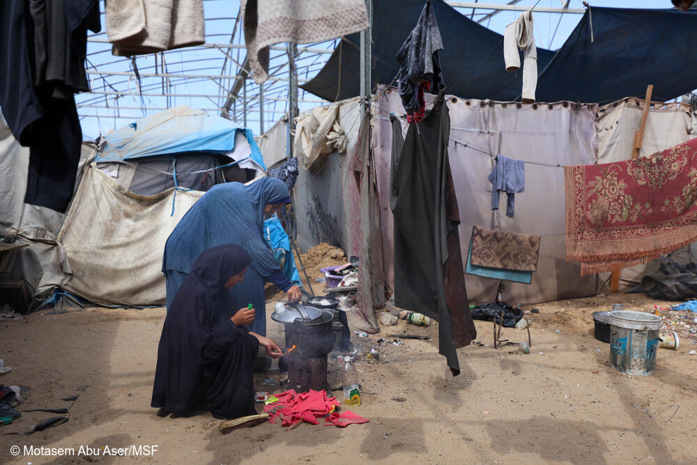 Una madre desplazada y su hija preparan la comida sobre un fuego abierto dentro de su tienda de campaña en Mawasi, Khan Yunis. Con acceso limitado al gas para cocinar o a instalaciones de cocina adecuadas, muchas familias de la superpoblada zona costera se ven obligadas a recurrir a métodos básicos y peligrosos para cocinar.