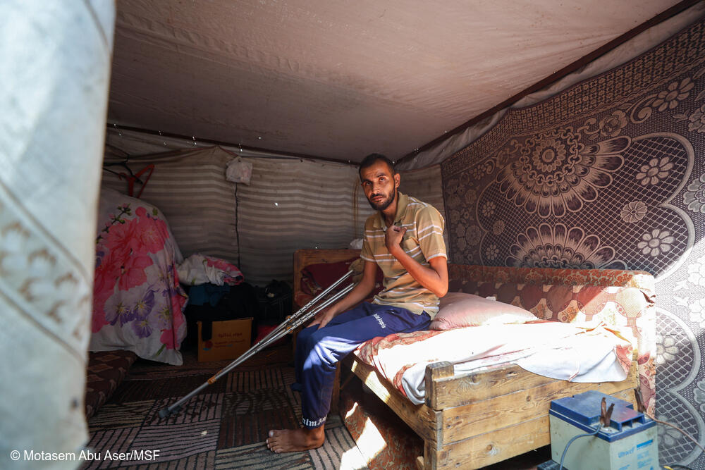 Bassel está sentado en una cama en su tienda de campaña para desplazados en Mawasi, Jan Yunis. Sufrió la amputación de una pierna tras recibir un disparo en un centro de distribución de ayuda humanitaria. Es originario de Rafah, ciudad que ha sido destruida por las fuerzas israelíes, lo que le ha dejado a él y a miles de personas sin un hogar al que regresar.