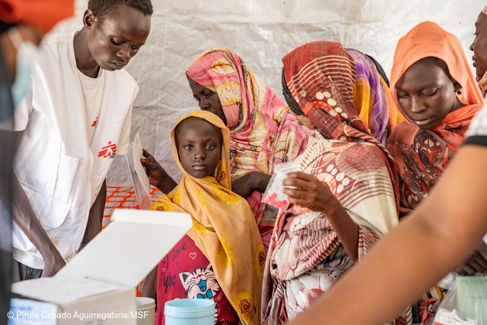 Aisha Ibrahim acompaña a su madre a una clínica móvil en Atam, gestionada por MSF para personas refugiadas que huyen de la guerra en Sudán. Condado de Renk, Sudán del Sur.