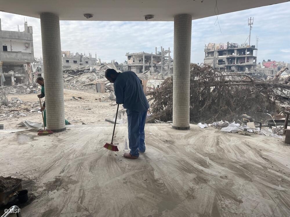 Hombre limpia los escombros dentro del hospital Emiratí en la ciudad de Rafah, en el sur de Gaza, Palestina
