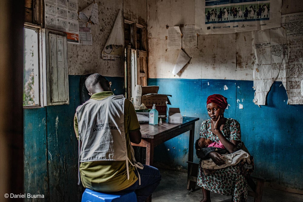 Una madre y su bebé reciben una consulta en una clínica móvil de MSF, una de las varias instaladas en localidades remotas de Kivu del Norte para brindar apoyo a las personas desplazadas de los campamentos de Goma que regresaron a sus pueblos de origen. Provincia de Kivu del Norte, República Democrática del Congo.