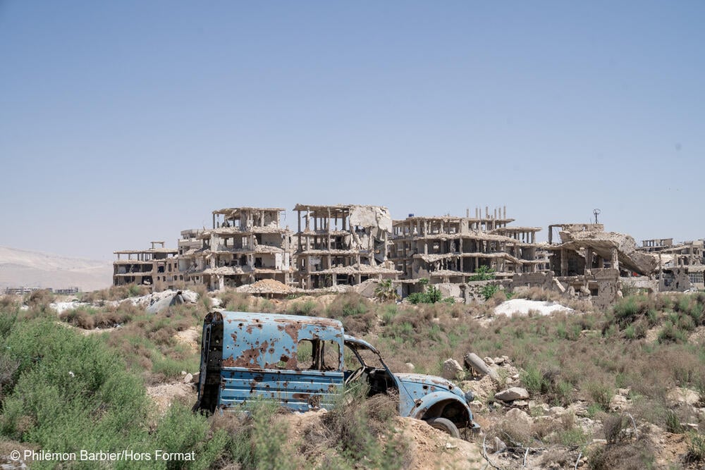 Un auto y varios edificios destruidos por la guerra permanecen abandonados en Hamouriyah, en Ghouta Oriental. Siria.