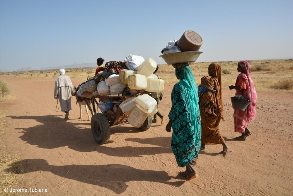 Una familia transporta sus pertenencias mientras se ve obligada a desplazarse debido al conflicto en curso en los alrededores de Tawila. Darfur, Sudán.