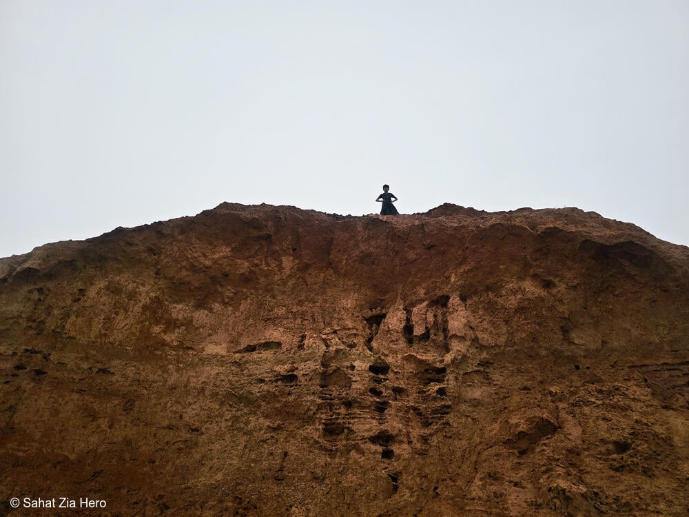 Un niño observa los campamentos desde la cima de una colina erosionada