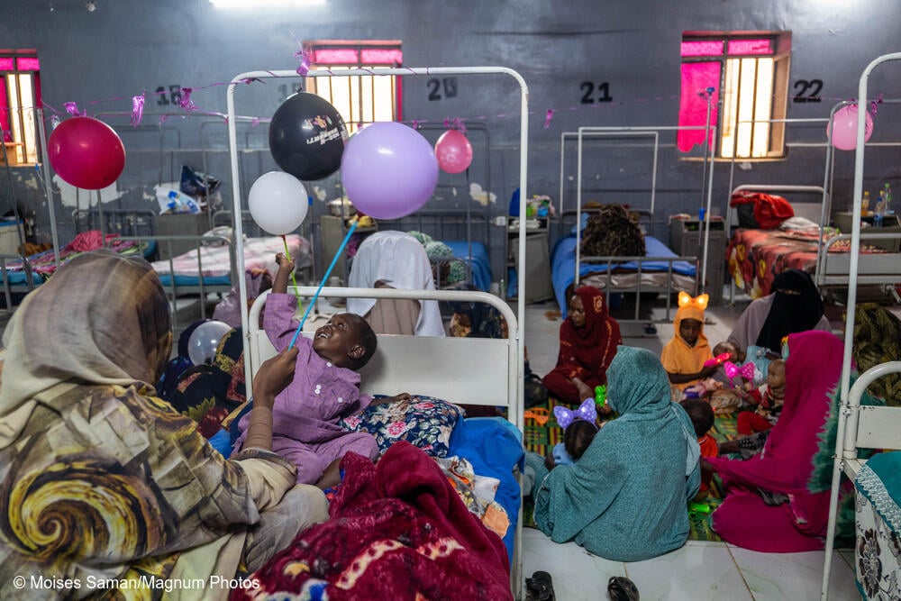 En la sala pediátrica del hospital docente de El Geneina, niñas y niños participan en una sesión de apoyo en salud mental que utiliza globos y juguetes, ofreciendo un momento poco común de alegría para pacientes jóvenes y familias desplazadas que atraviesan el trauma de la guerra. El Geneina, Darfur Occidental, Sudán.