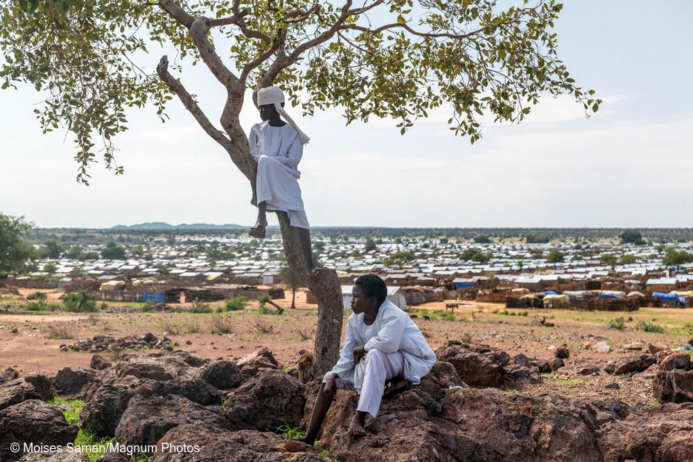Dos niños sudaneses descansan sobre una colina rocosa con vistas al extenso campamento de refugiados de Aboutengue, donde viven decenas de miles de personas que huyeron de la violencia étnica en la región de Darfur Occidental, en Sudán. El campamento, ubicado cerca de la frontera oriental de Chad con Sudán, se convirtió en un refugio tras el recrudecimiento de los combates en 2023, que devastaron ciudades como El Geneina. Provincia de Ouaddai, Chad.
