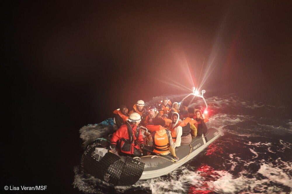 El equipo de MSF rescata a 27 personas en peligro a bordo de una embarcación de goma. La escena integra las imágenes del año del trabajo de búsqueda y rescate en el mar Mediterráneo.